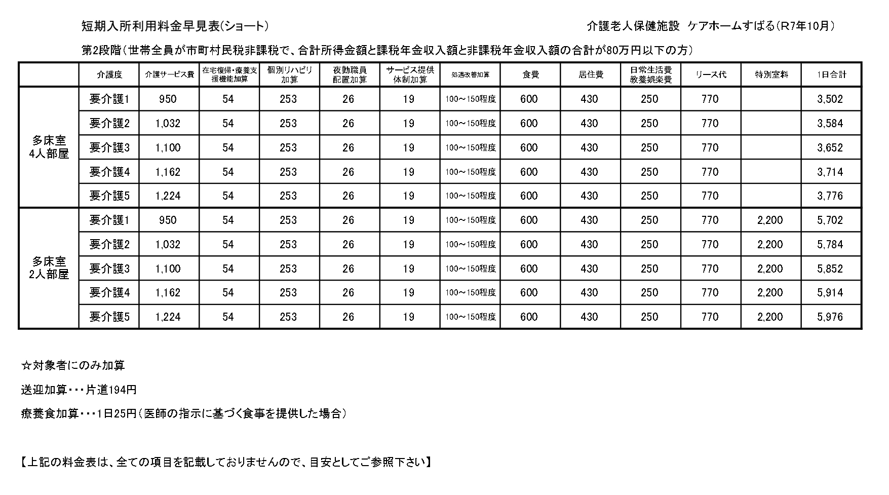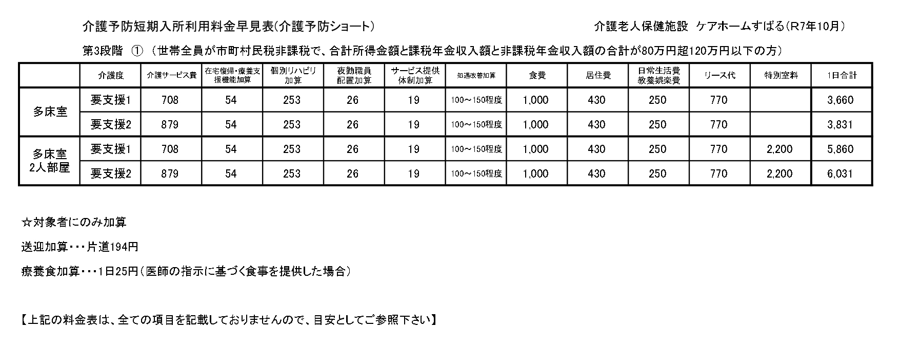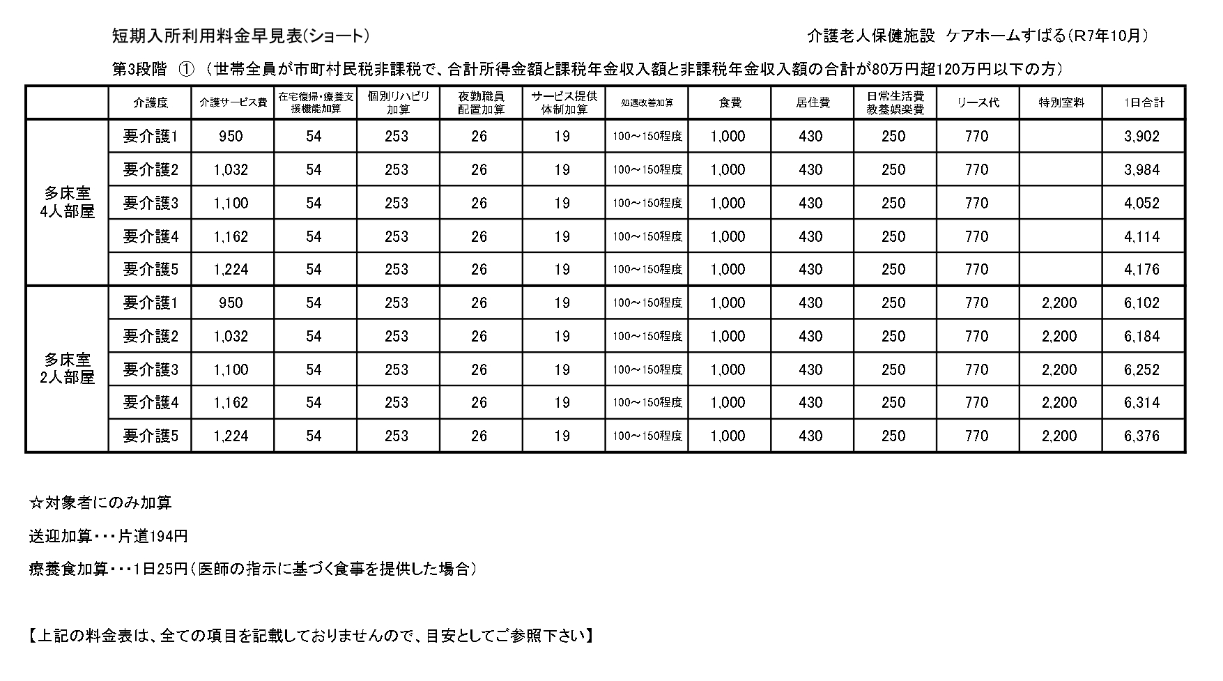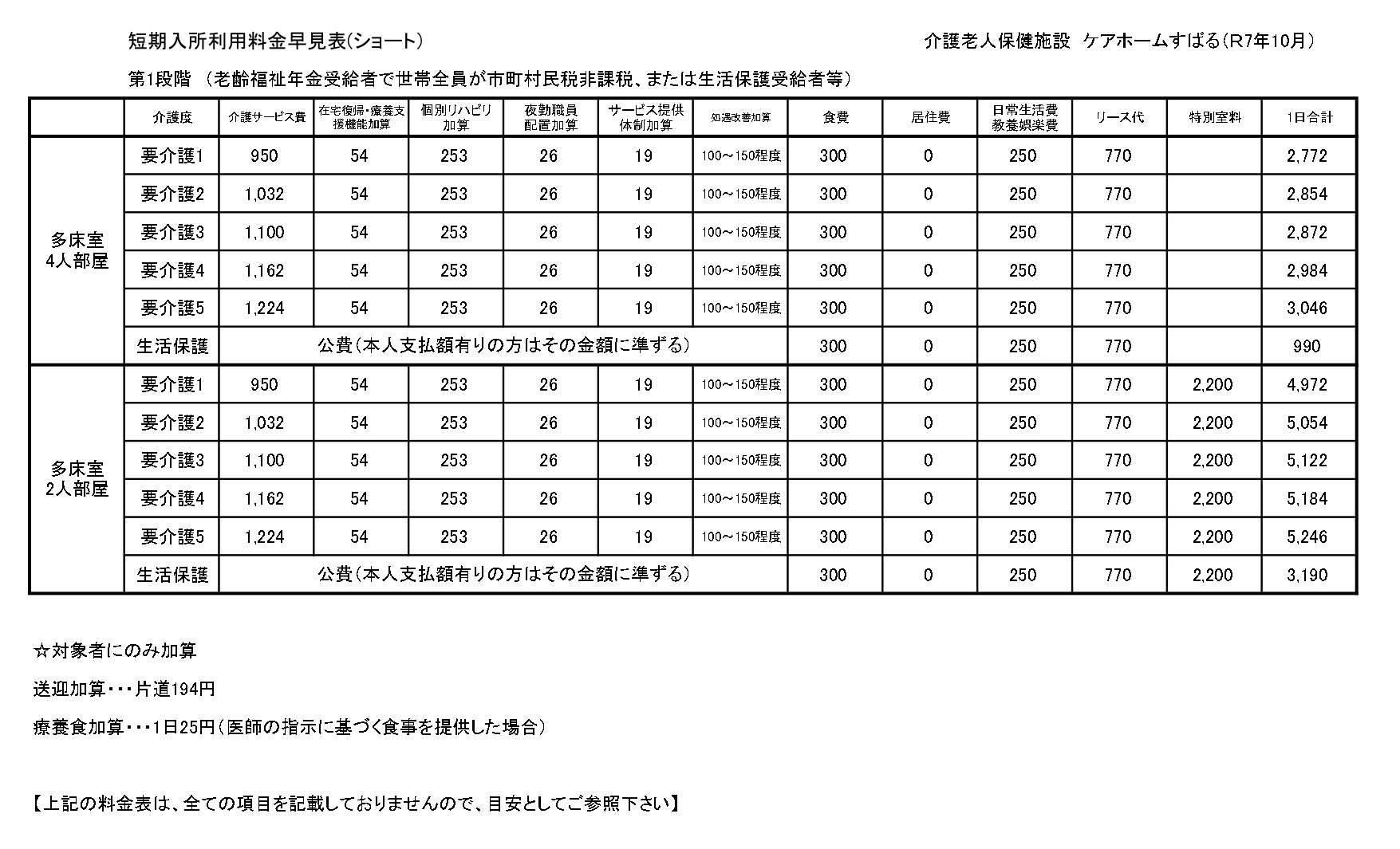 ■短期入所療養介護(ショートステイ)サービス料金